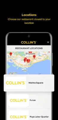 - Order on-the-go, earn COLLIN'S® CRewards-points, and self-collect at your favorite COLLIN'S® restaurant or choose islandwide delivery!