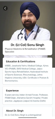 With a mission to simplify appointment booking and improve access to specialist care, the app connects users directly with Dr. (Lt Col) Sonu Singh, a highly experienced rehabilitation physician offering both in-person and online consultations.