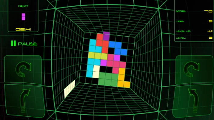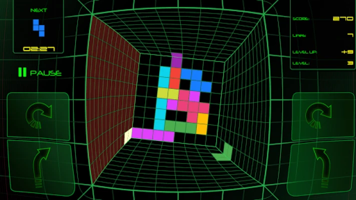 Imaging that you are looking into the square glass from the top. You see four walls and the bottom. The flat 2d blocks falling down from the walls one by one. Move them to fill rows or columns at the bottom, get scores for full rows and free some space for your next block!